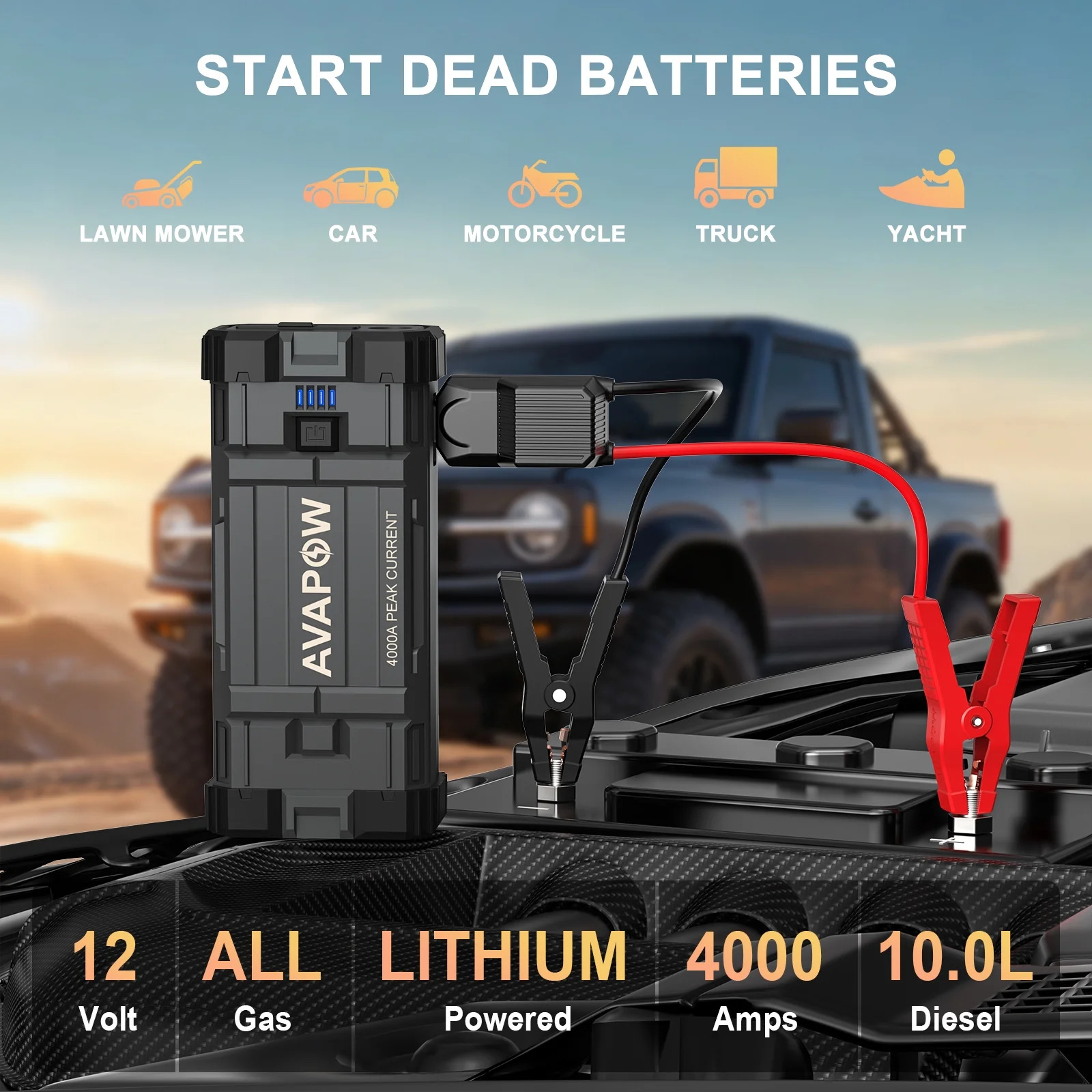 AVAPOW Car Jump Starter, 4000A Peak 27800mAh Battery Jump Starter (for All Gas or up to 10L Diesel), Battery Booster Power Pack, 12V Jump Box with LED Light, USB Quick Charge 3.0